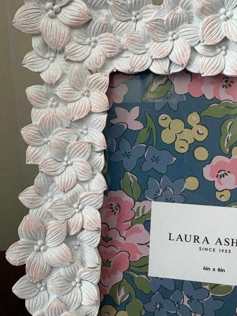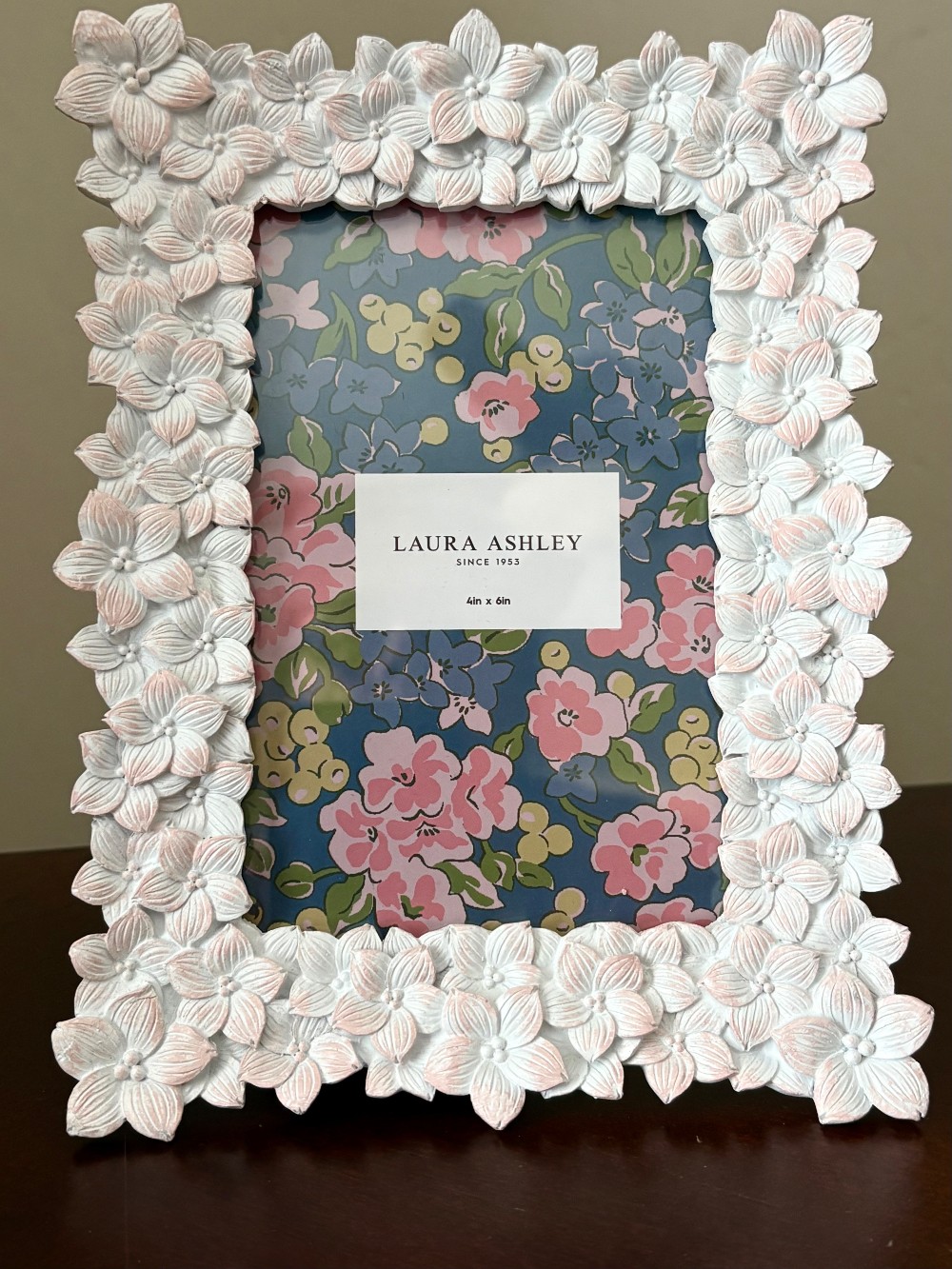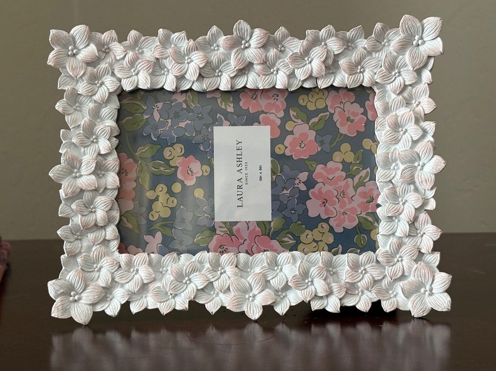 White picture frame by Laura Ashley, light pink color on petals. This item had never been used. 4in x6in.