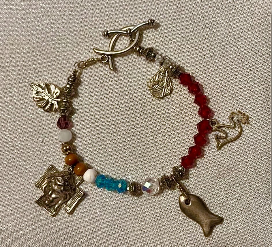 Beads and charms represent key events in the life of Jesus.
